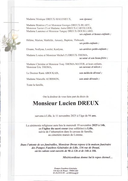 Les funérailles de Lucien se dérouleront le mercredi 19 novembre à 14h00 en l’église du Sacré Cœur